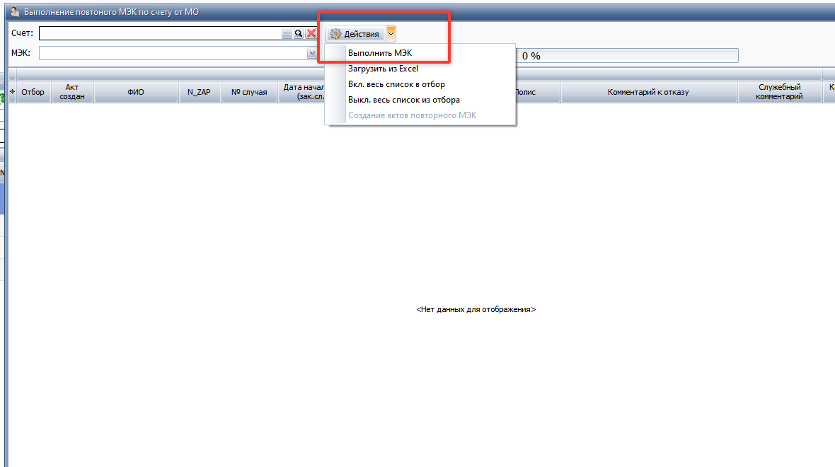 Далее выбрать пункт Действия -> Выполнить МЭК. При этом по счету. будет проведен МЭК по выбранной проверке. Если случай не пройдет проверку, он появится в списке и его можно будет отказать повторным МЭКом.